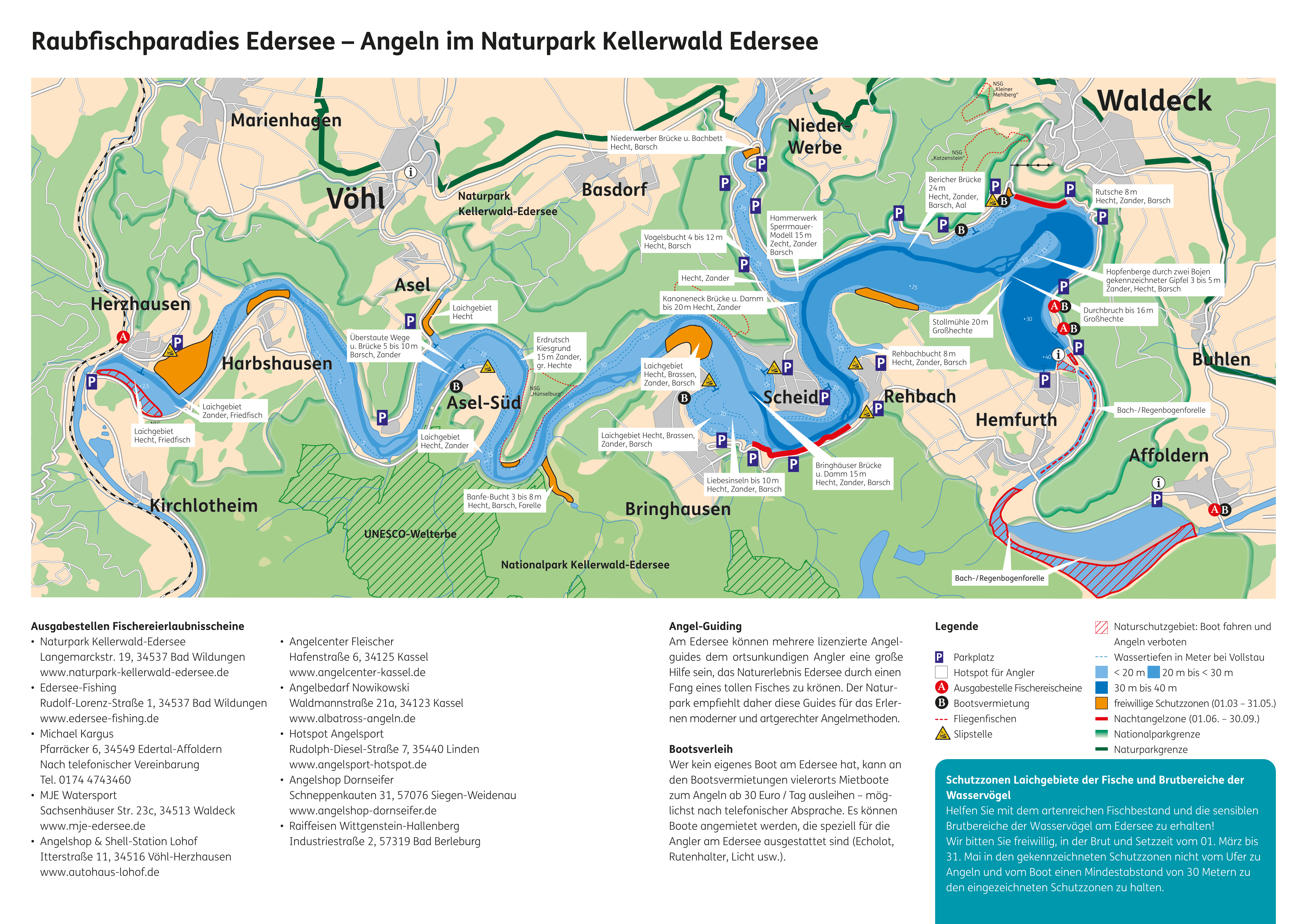 The Edersee is a special body of water - with 11,8 km² of water surface, it is the second largest reservoir in Germany. The Kellerwald-Edersee Nature Park has been the tenant of the fishing rights on the Edersee since 2003. Due to its location in the national park and sustainable management, it not only shines with its beauty, but also offers anglers excellent water quality and a diverse fish population.